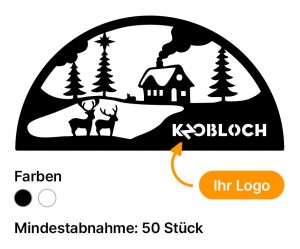 Das Motiv ist eine klassische Winterlandschaft mit Haus, Tannen und Rehen, ein Stück Handwerkskunst nach erzgebirgischem Vorbild. Wir fertigen den Schwibbogen in Stahlblech mit Pulverbeschichtung in den Farben Weiß oder Schwarz. Er eignet sich ideal als hochwertiges Weihnachts- oder Werbegeschenk. Die Mindestabnahmemenge beträgt 50 Stück – perfekt für Unternehmen, die Wert auf Stil und bleibenden Eindruck legen.