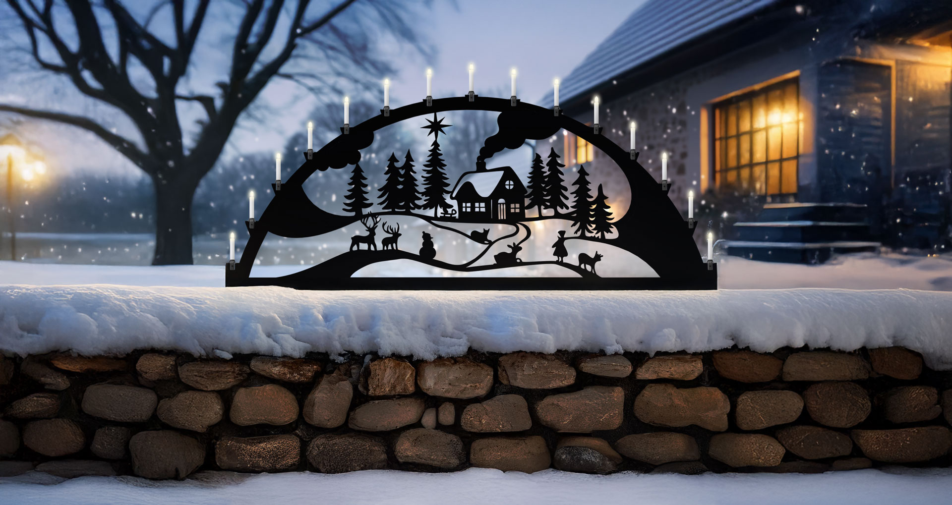 Alle Schwibbögen bestehen aus hochwertigem, pulverbeschichtetem Stahlblech. Mit einem traditionellen oder einem modernen Motiv, mit oder ohne eigenem Branding: Ein Schwibbogen von KNOBLOCH sorgt in jedem Umfeld für stimmungsvolles Licht und bleibende Erinnerungen.