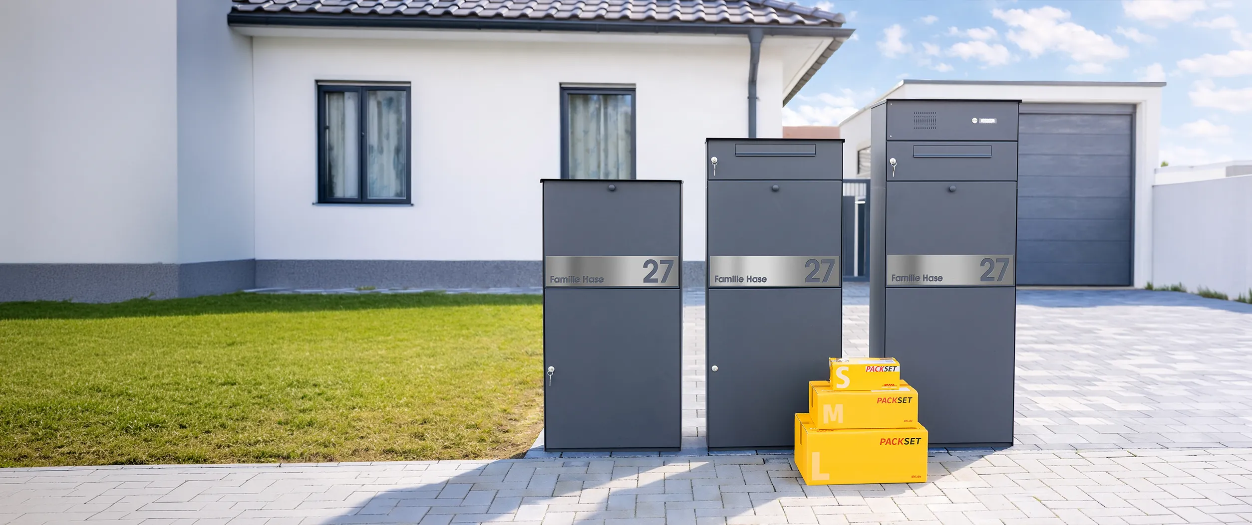 Die einzelnen Ausführungen der Serie kombinieren Paketbox, Briefkasten und Funktionsmodule in klar definierten Varianten. Zusätzlich stehen spezielle Modelle für besondere Einbausituationen wie die Zaunmontage zur Verfügung.