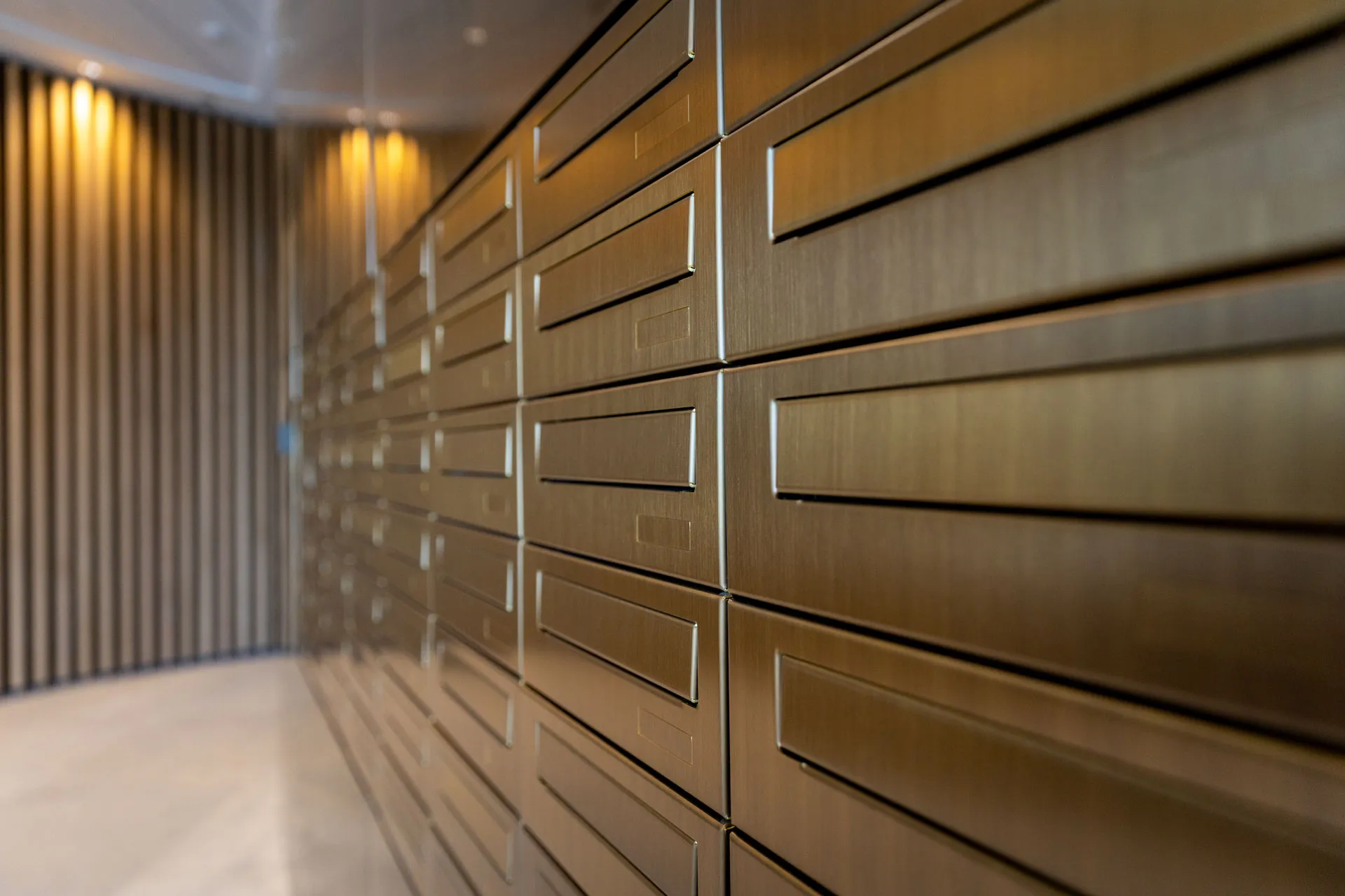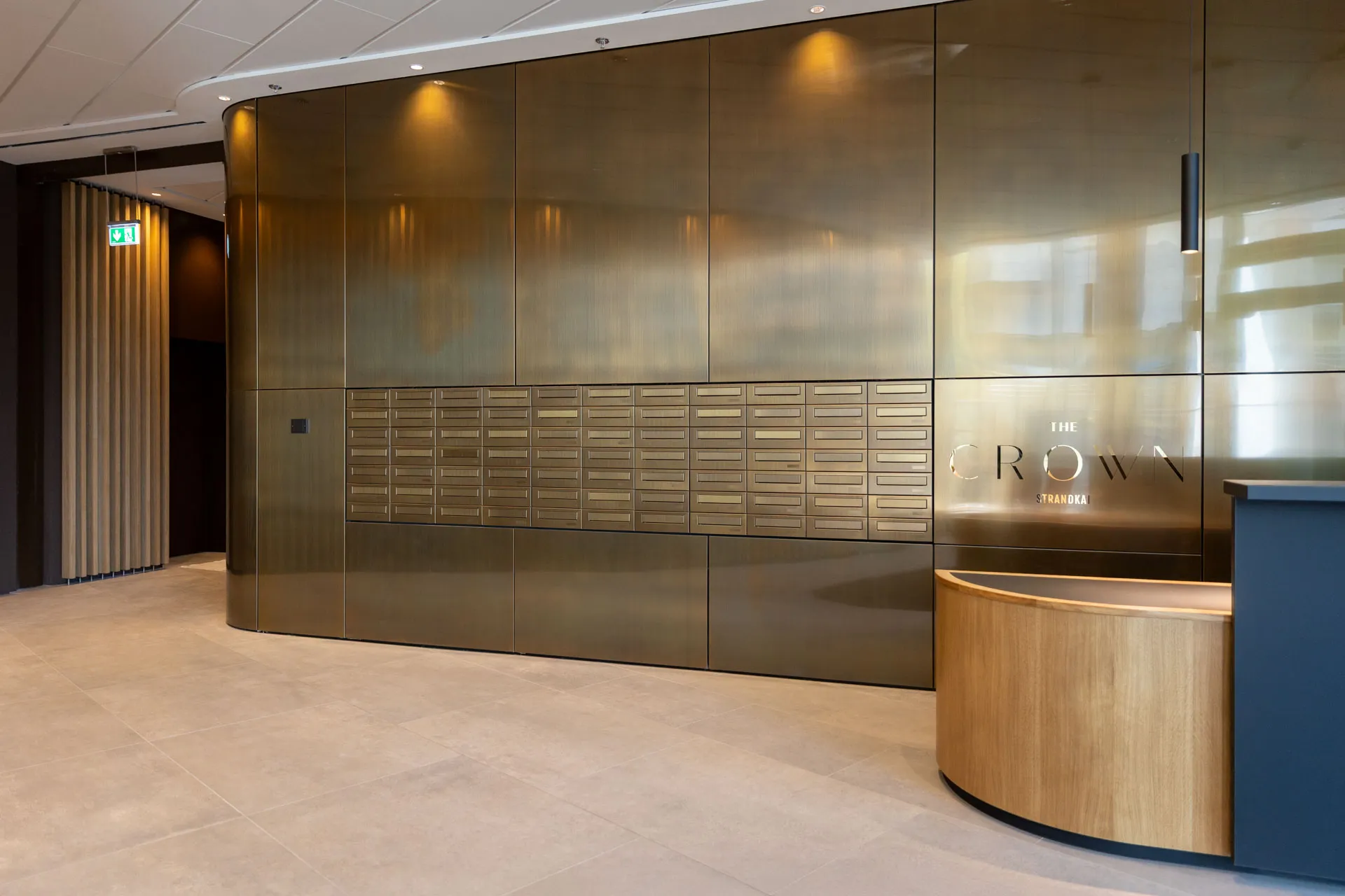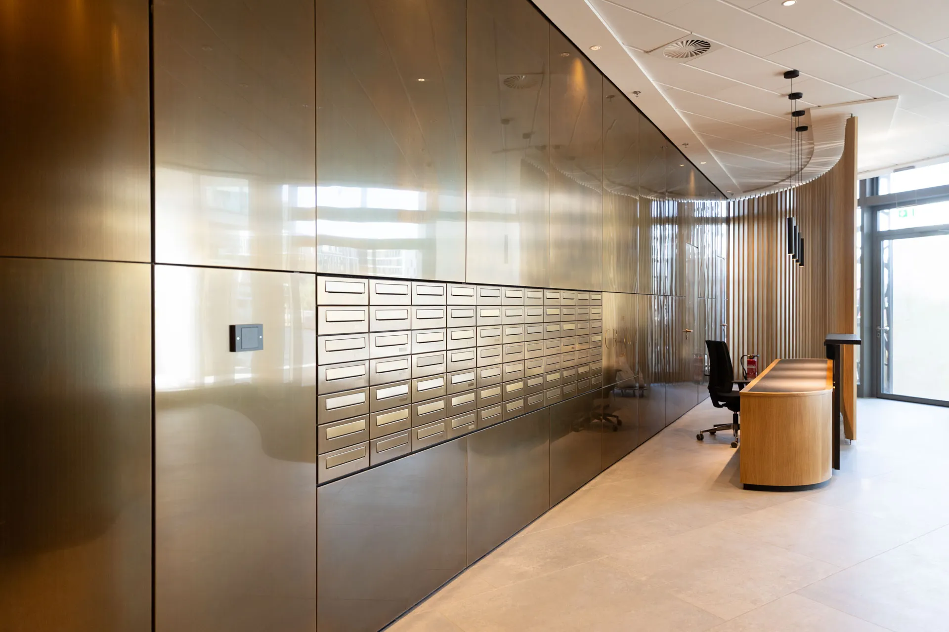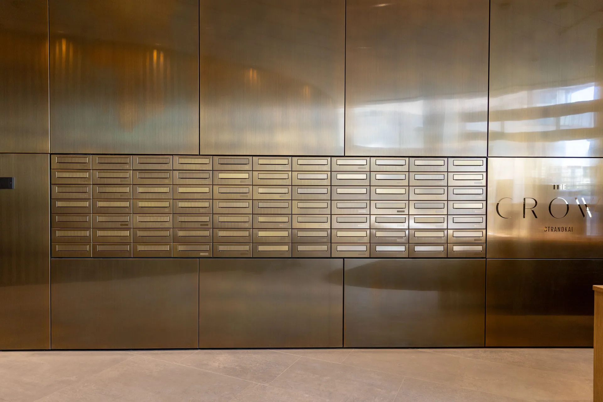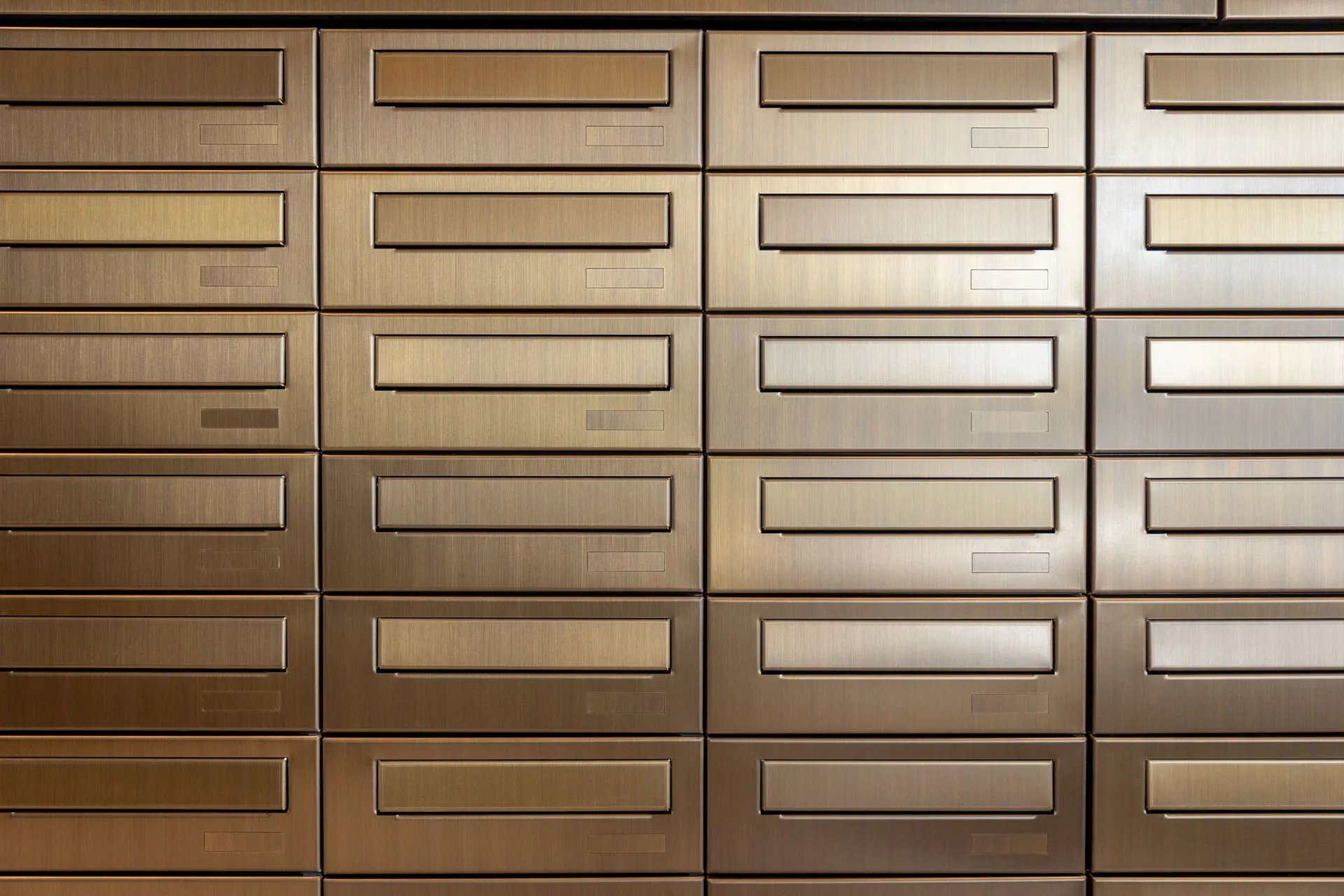 Unterputz-Briefkastenanlage aus Stahlblech und Messing mit